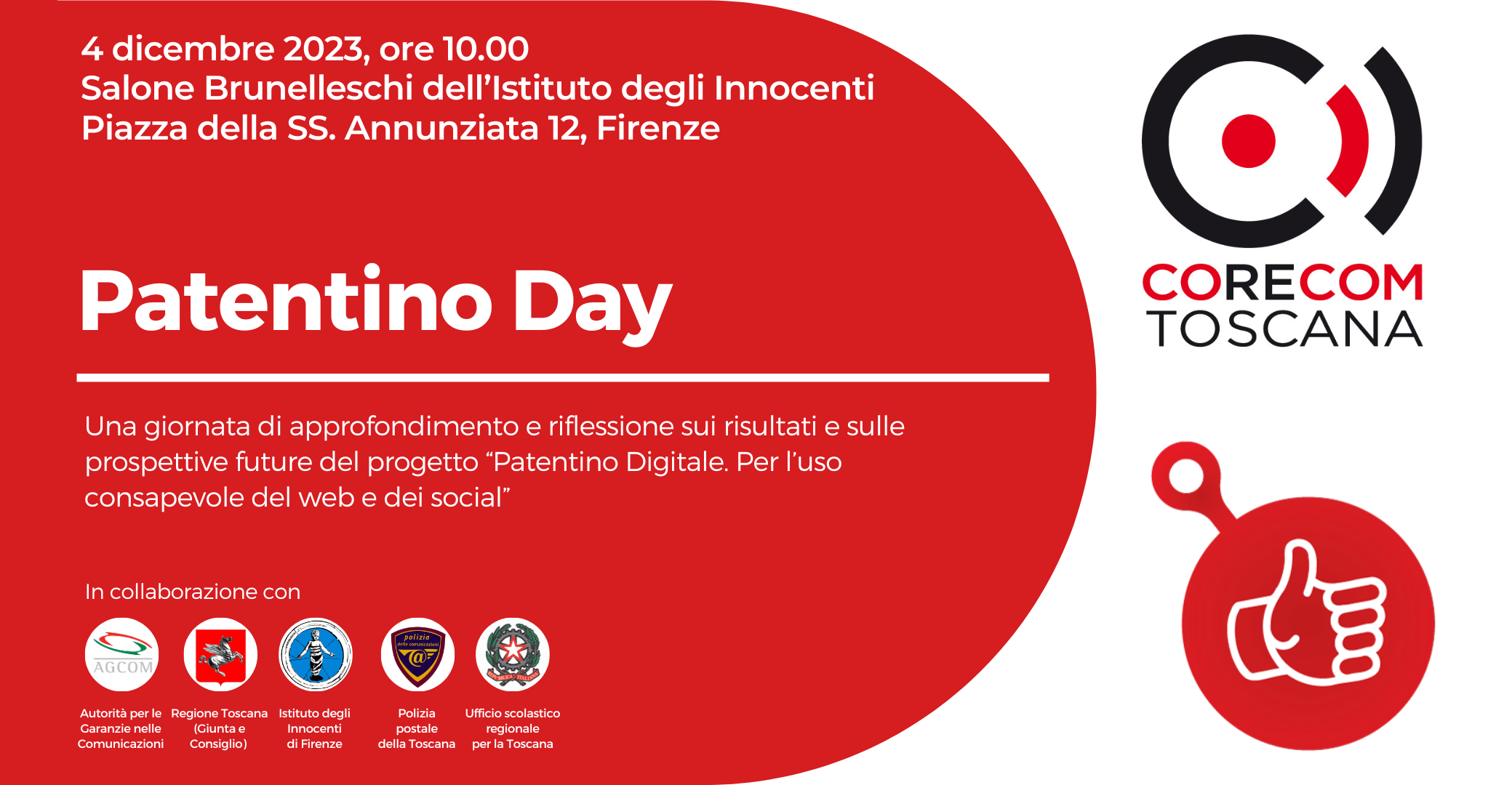 Patentino Day: una giornata di approfondimento e riflessione sui risultati e sulle prospettive future del progetto "Patentino Digitale. Per l'uso consapevole del web e dei social". Lunedì 4 dicembre 2023, ore 10 nel Salone Brunelleschi dell'Istituto degli Innocenti (Piazza SS. Annunziata 12 Firenze).